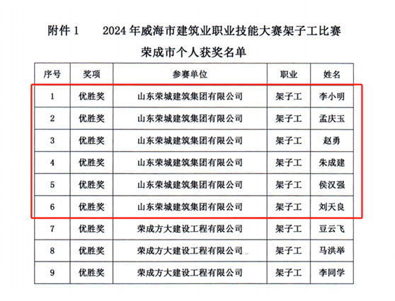 2024年6月21日,由威海市人力資源和社會(huì)保障局、威海市總工會(huì)、威海市住房和城鄉(xiāng)建設(shè)局主辦,威海市建筑工程服務(wù)中心、臨港區(qū)住房和城鄉(xiāng)建設(shè)局、威海市建筑業(yè)協(xié)會(huì)承辦的2024年度威海市建筑業(yè)架子工職業(yè)技能大賽在環(huán)翠區(qū)萬禾書院項(xiàng)目部舉行。比賽現(xiàn)場,23支隊(duì)伍的69名參賽選手穿著整齊的工作服,頭戴安全帽,身著工服,精神飽滿,動(dòng)作嫻熟,有條不紊的進(jìn)行一系列工藝操作,展示著扎實(shí)的專業(yè)功底和豐富的技能經(jīng)驗(yàn)。經(jīng)過數(shù)小時(shí)的激烈角逐,我司架子工代表李小明、孟慶玉、趙勇、朱成建、侯漢強(qiáng)、劉天良獲得優(yōu)勝獎(jiǎng),公司獲得團(tuán)體三等獎(jiǎng)的好成績。